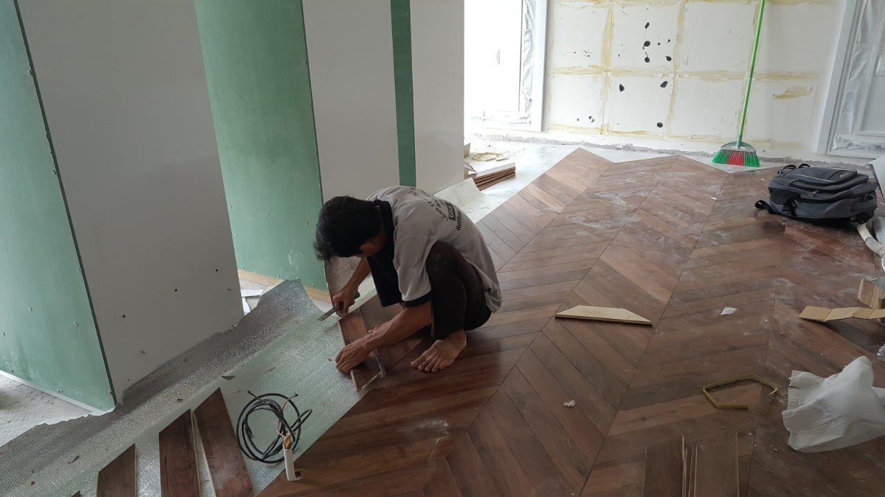 Hoàn thiện sàn gỗ walnut (óc chó) Engineer lắp xương cá căn hộ Garden cour 1 – Phú Mỹ Hưng – Quận 7