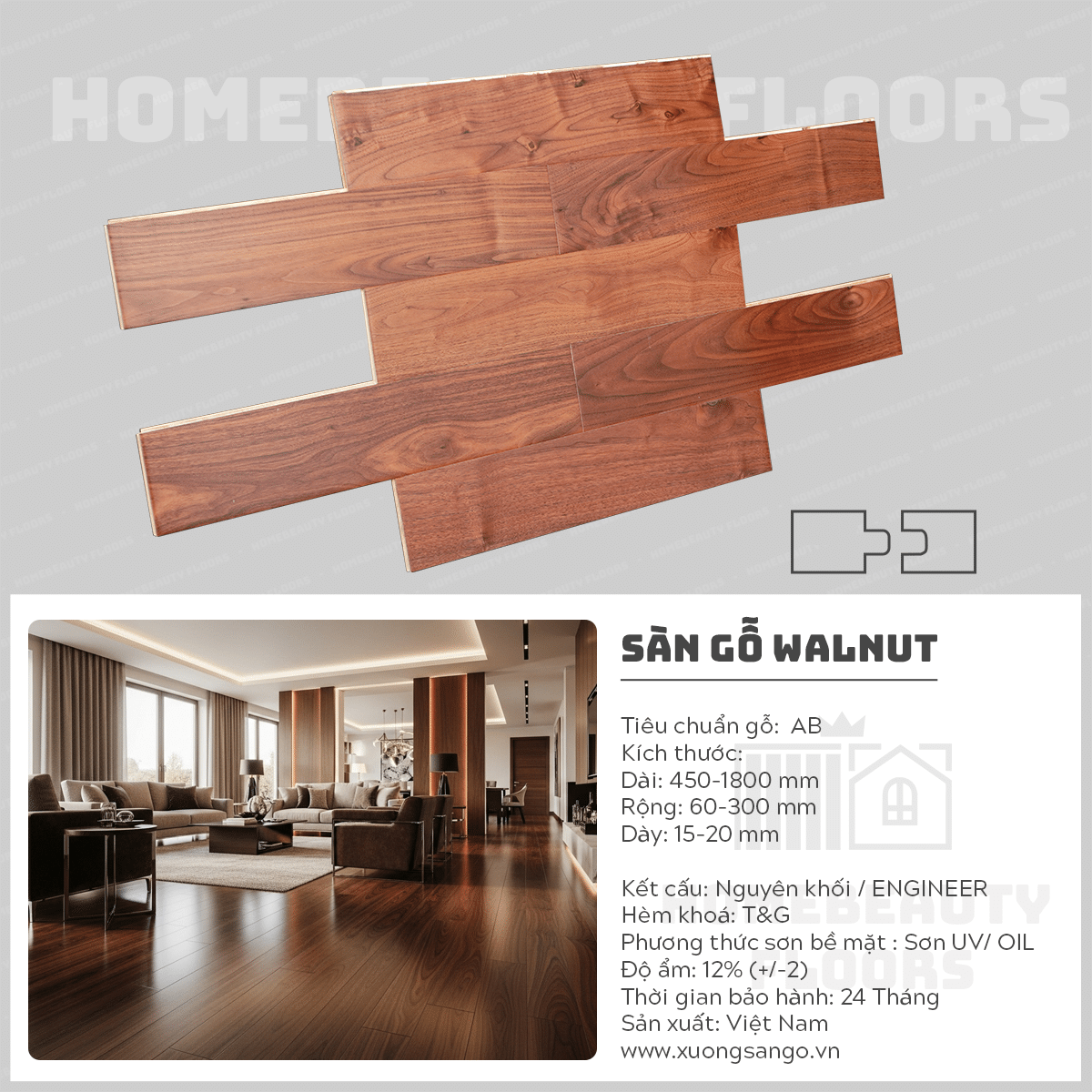 • Tính Bền Vững: Người tiêu dùng ngày càng quan tâm đến việc chọn lựa các sản phẩm có nguồn gốc bền vững và thân thiện với môi trường. Sàn gỗ walnut từ nguồn gỗ tái chế hoặc từ các nguồn gỗ có nguồn gốc bền vững đáp ứng yêu cầu này, mang lại sự yên tâm cho người tiêu dùng.